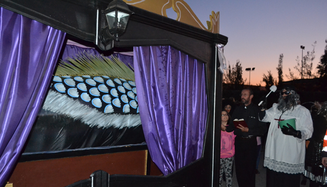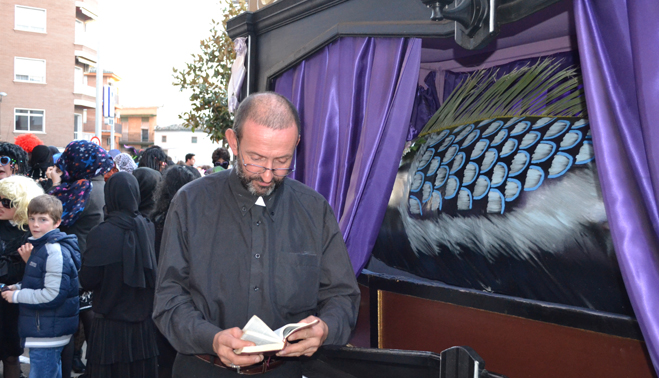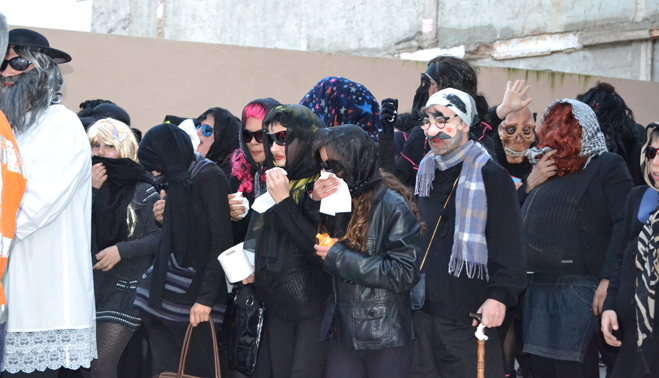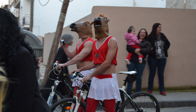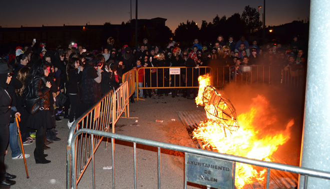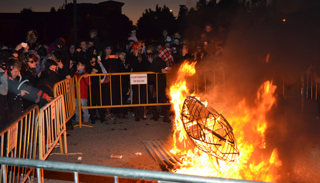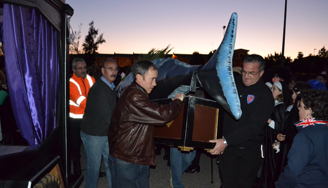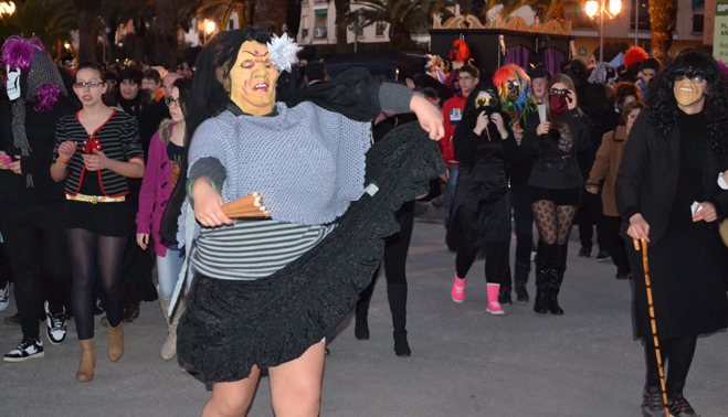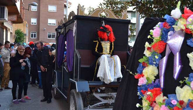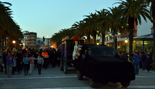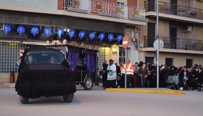 Pocos minutos después de las siete de la tarde, el cortejo fúnebre encabezado por el coche mortuorio y la sardina, emprendía el recorrido por el centro de Bailén hasta llegar al recinto ferial, lugar donde se encontraba ubicado el “crematorio”. Plañideras, viudas y algún que otro disfraz despistado formaban el duelo que acompañaba a la ya fallecida sardina para darle el último adiós por este 2014. En poco menos de una hora completaban el itinerario, congregando a varios cientos de bailenenses que veían cómo sólo iban quedando las “raspas”.