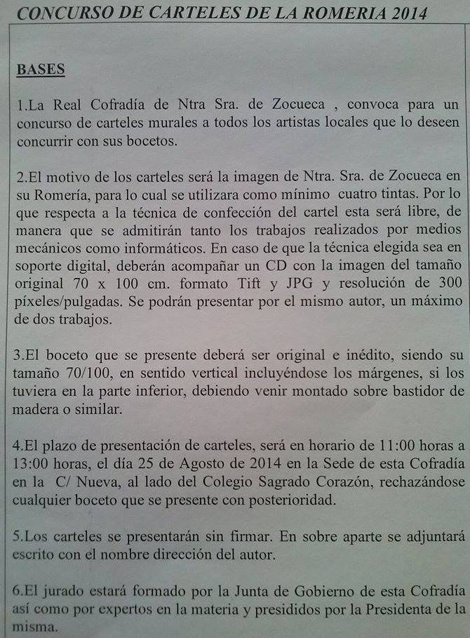 Entre las bases, que a continuación mostramos, podemos destacar que el motivo del cartel no puede ser otro que la imagen de Ntra. Sra. de Zocueca en su romería, siendo estos totalmente originales e inéditos con unas dimensiones de 70 x 100 cm.