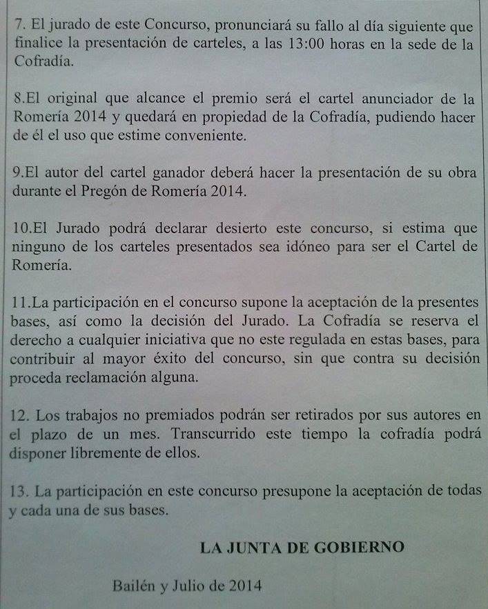 Los interesados, que podrán presentar hasta dos trabajos, deberán entregar los bocetos el día 25 de Agosto en horario de 11 a 13 horas en la sede de la cofradía, junto al Colegio Sagrado Corazón. El ganador, además de ilustrar el cartel de la romería deberá de presentarlo públicamente en el Pregón de la Romería 2014.
