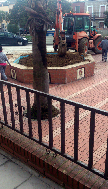 - Momento en que los operarios municipales llenaban de tierra la fuente de la Plaza de Andalucía